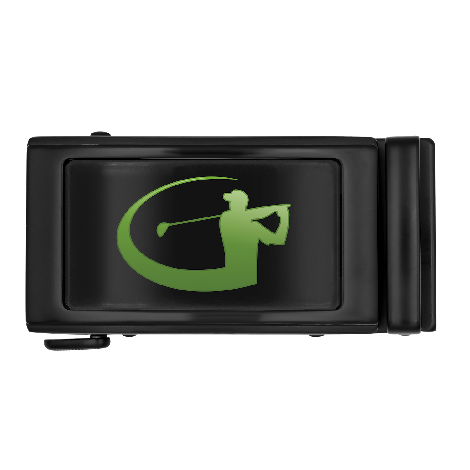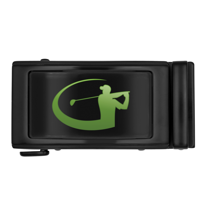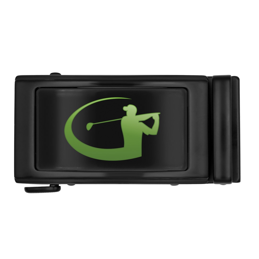 The Black Onyx ZippyDisc™ by ZippyBelts™️ is a matte black belt accessory featuring a green golfer swinging inside a stylized "G"—a sleek custom belt disc perfect for golf enthusiasts.