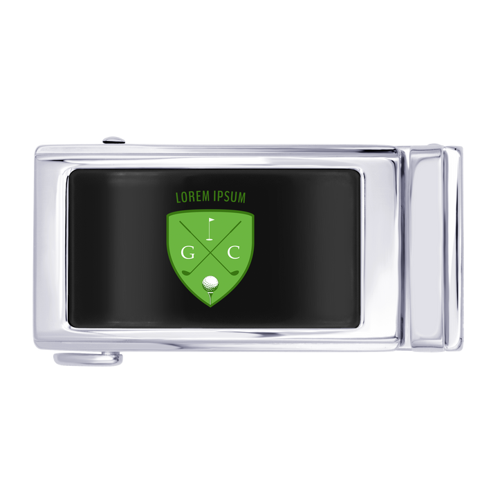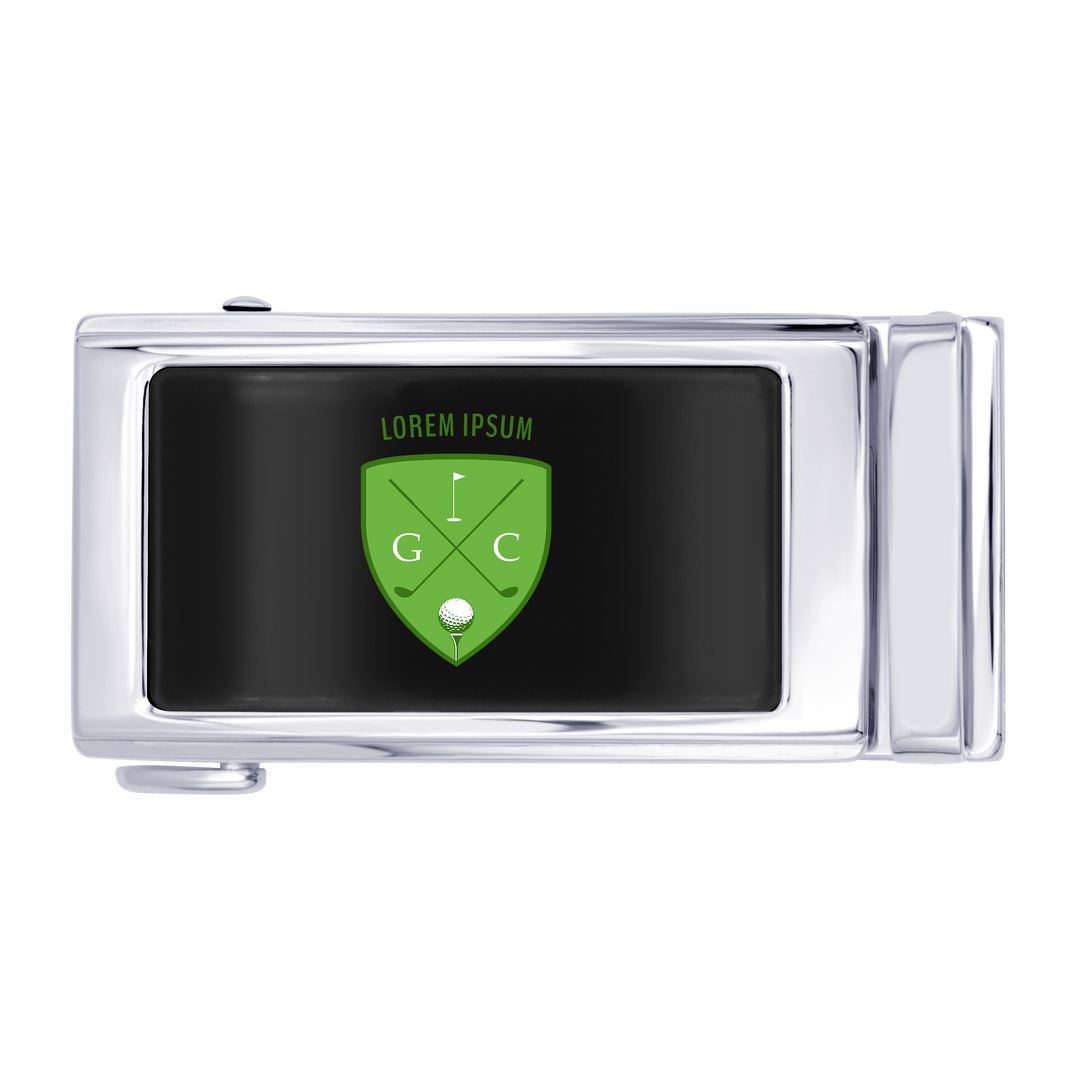 The Black Onyx ZippyDisc™ by ZippyBelts™️ is a sleek silver money clip with a black insert and golf ball emblem, making it the ideal matte black belt accessory for any golf enthusiast.