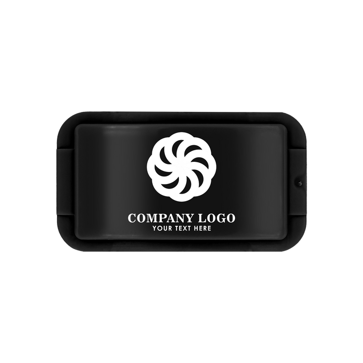 The Black Onyx ZippyDisc™ by ZippyBelts™️ is a matte black belt accessory with a white abstract circular logo and "COMPANY LOGO YOUR TEXT HERE" printed on the rectangular front case.