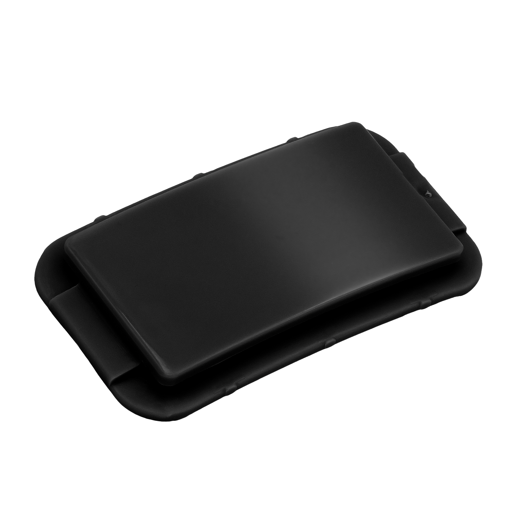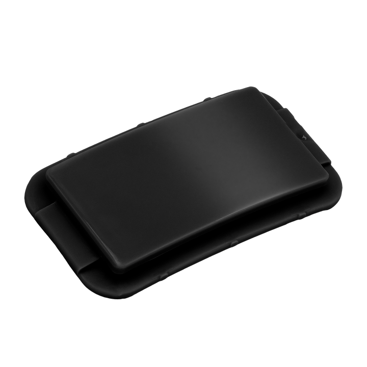 A Black Onyx ZippyDisc™ by ZippyBelts™️, a black rectangular accessory with rounded edges, is shown on a white background.