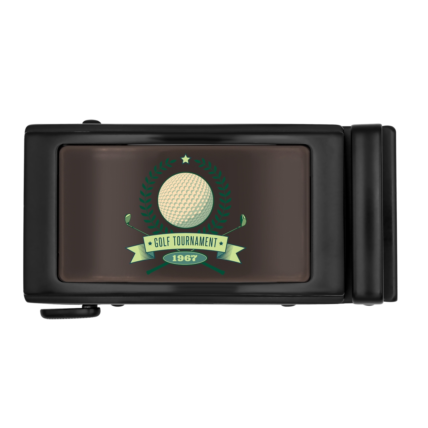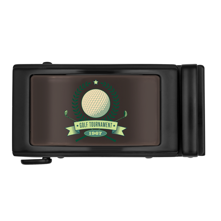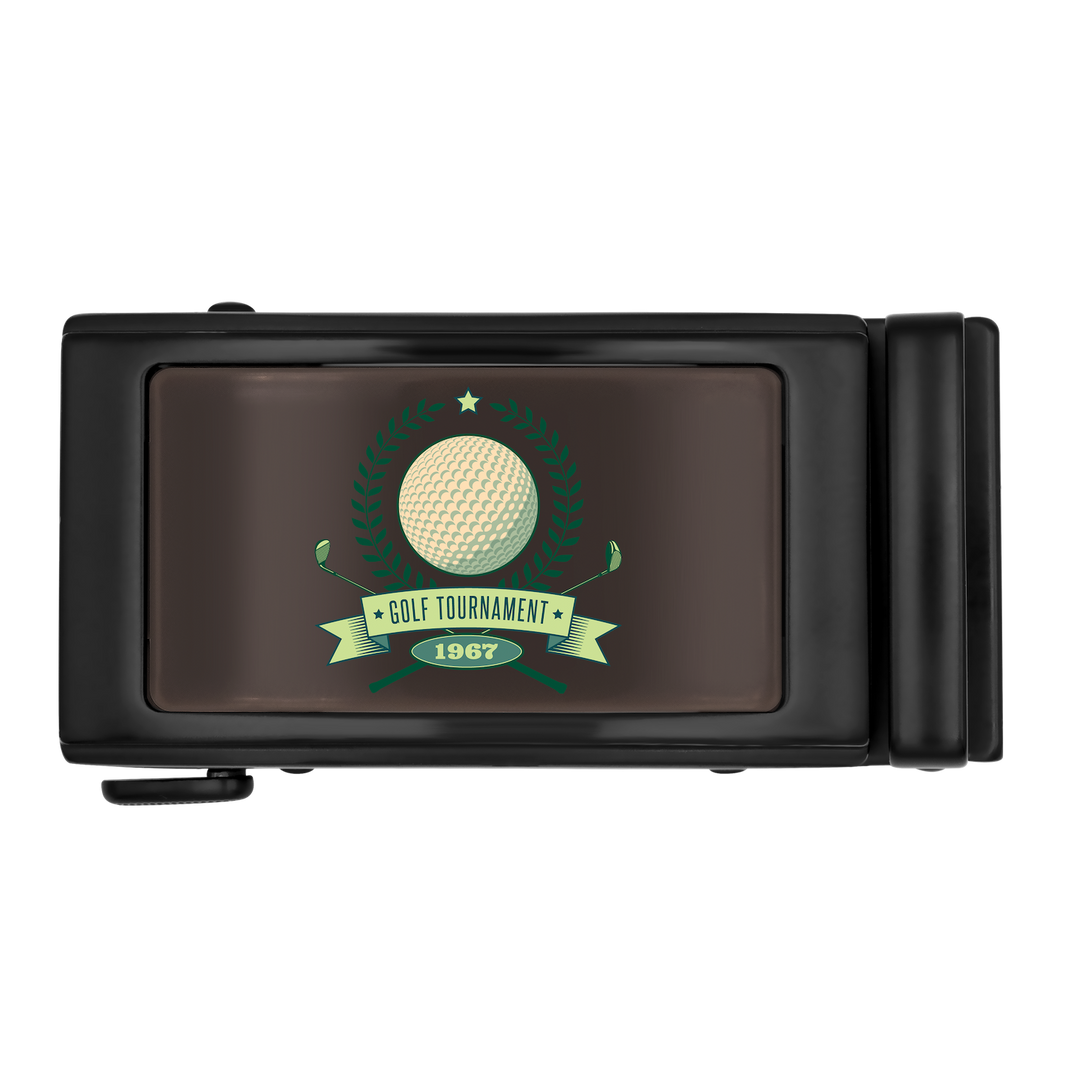 The Brown Onyx ZippyDisc™ by ZippyBelts™️ features a golf ball design with green laurel wreaths, a "Golf Tournament 1967" banner, and space for custom event branding—perfect for commemorating your heritage disc moments.
