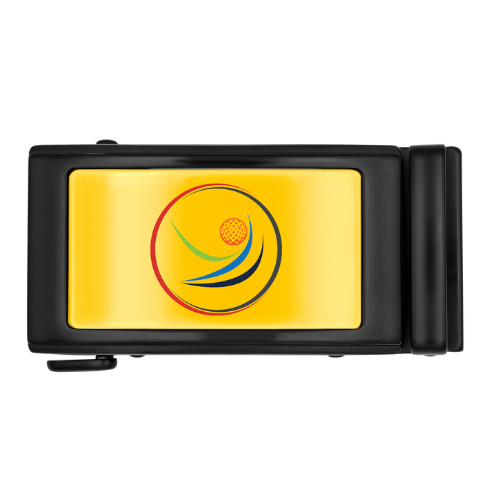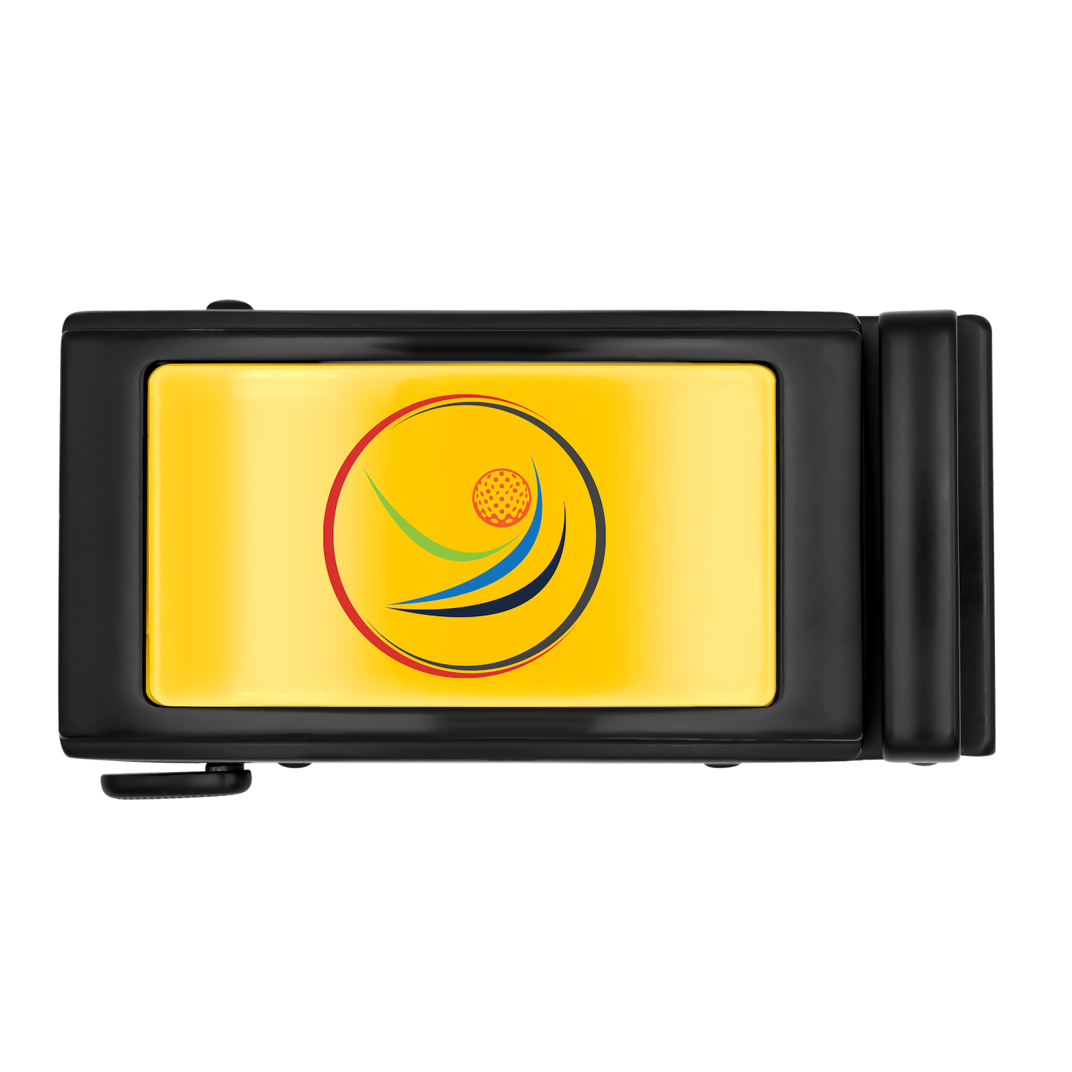The Yellow Onyx ZippyDisc™ by ZippyBelts™️ is a rectangular belt buckle with a golf ball and colorful curved logo set in black—ideal for fans of vibrant disc golf and stylish, premium team accessories.