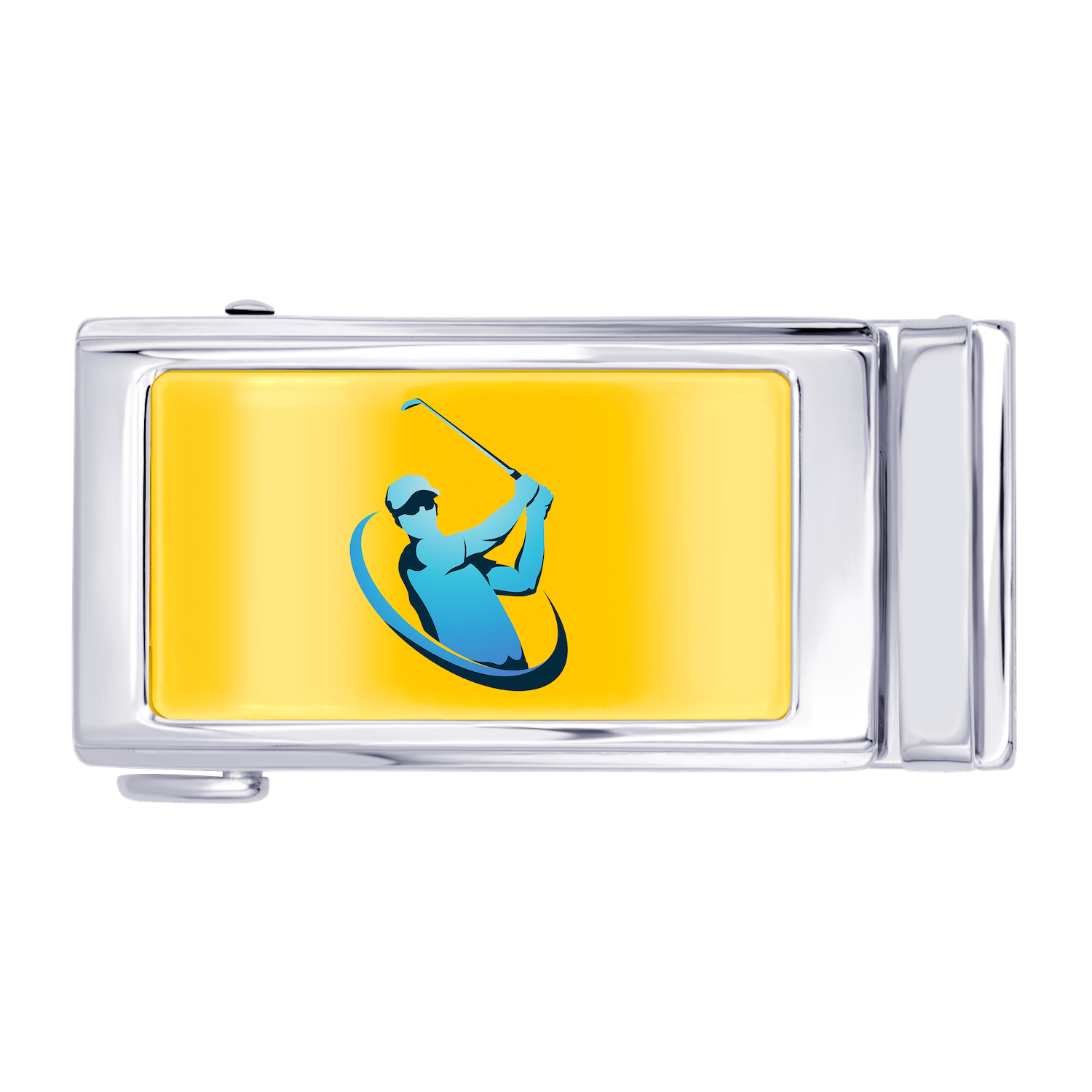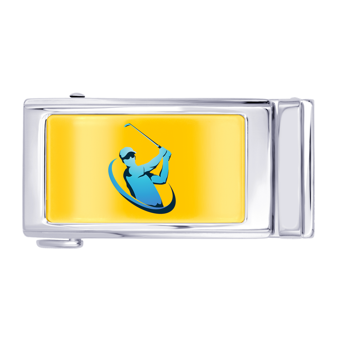 The ZippyBelts™️ Yellow Onyx ZippyDisc™ is a silver rectangular money clip with a yellow face and blue golfer silhouette—an ideal premium accessory for vibrant disc golf enthusiasts.